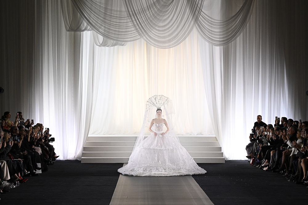 Η κινηματογραφική αίγλη βρίσκεται στην καρδιά αυτής της συλλογής, θεμελιωμένη στο παραδοσιακό couture savoir-faire. Από το ατελιέ του Οίκου στην Αθήνα μέχρι το Παρίσι και το Χόλιγουντ, τα φτερά, η λάμψη και η φαντασία μεταφράζονται σε μια σύγχρονη γλώσσα απόλυτης φινέτσας. Μαύρες βελούδινες κουρτίνες πλαισιώνουν την αίθουσα Pavillon Cambon, ενώ το catwalk είναι τυλιγμένο με ατελείωτα μέτρα λευκού σιφόν, δημιουργώντας ένα μοναδικό θέαμα. Τα μοντέλα κατεβαίνουν τα σκαλιά, φέροντας τον μεθυστικό αέρα του Old Hollywood στην καρδιά του Παρισιού και στην πασαρέλα με δημιουργίες της Σίλιας Κριθαριώτη περπάτησε μεταξύ άλλων και η Ανθή Φακιδάρη, μοντέλο της Victoria’s Secret.